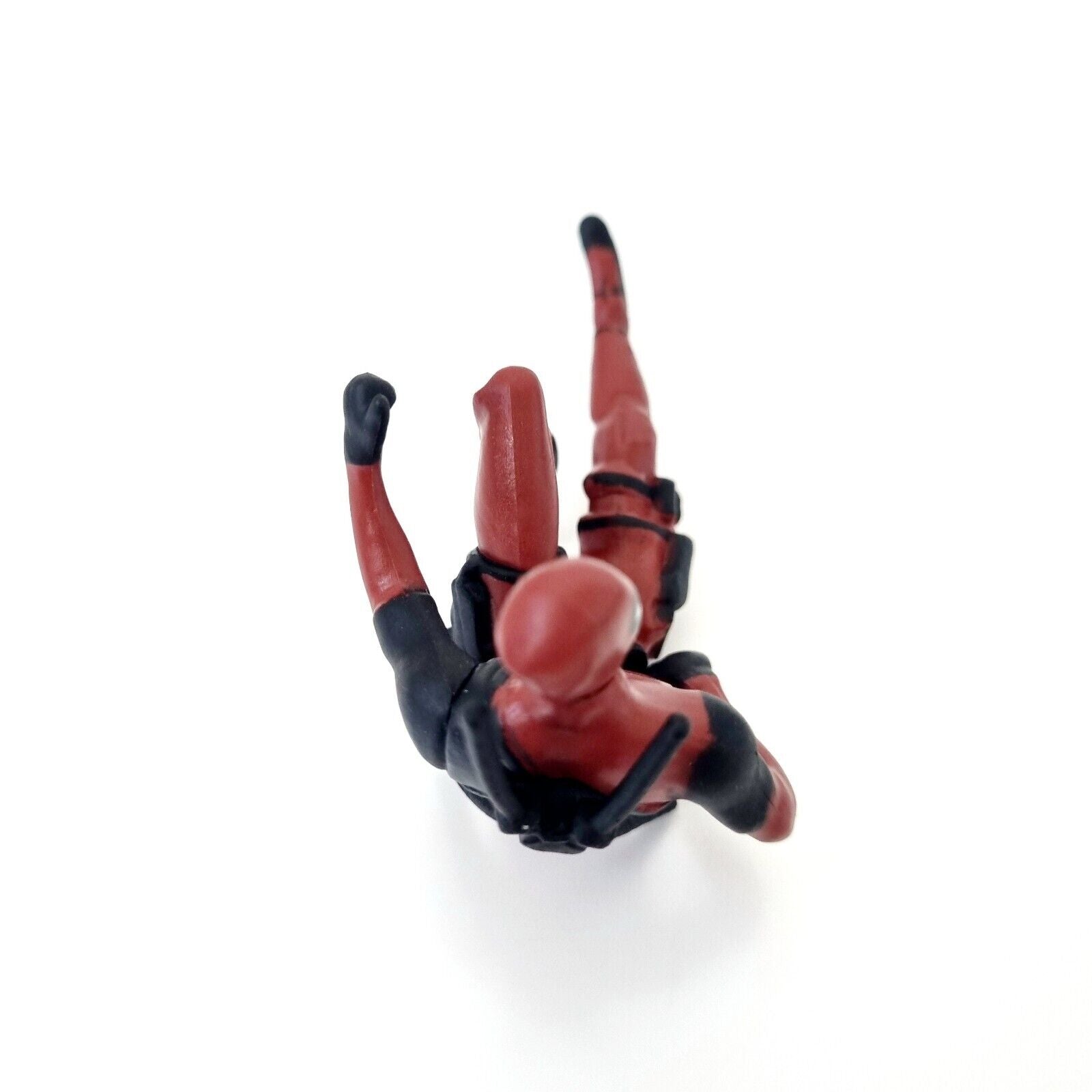 Design Details: Features Deadpool in his signature red and black suit, casually sitting.